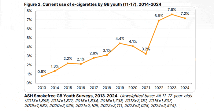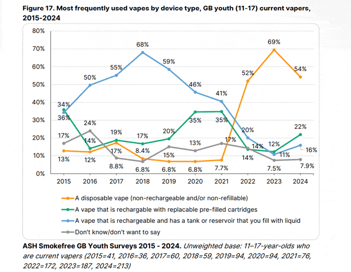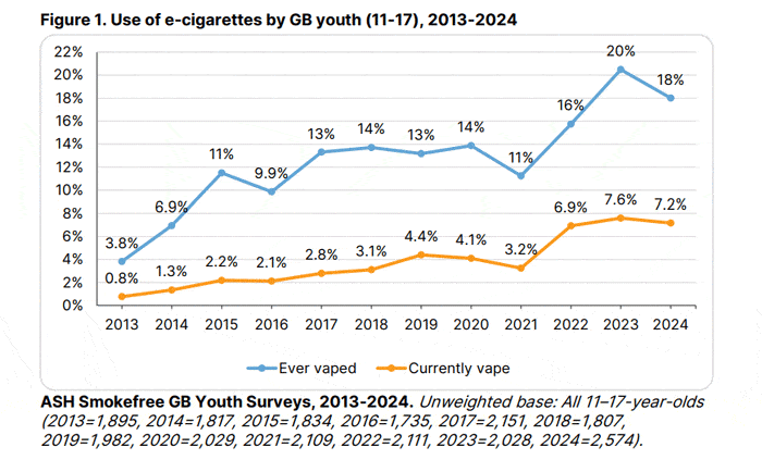 Also the figure of 11-17 year olds who had ever tried a vape has dropped. This was 20% in 2023 and is down to 18% in 2024.
