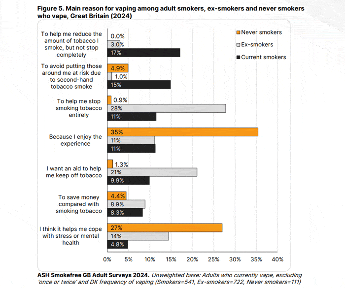 28% of ex-smokers cite “help them to quit smoking” as their reason for vaping. And 21% state they vape to help them “prevent relapse”.