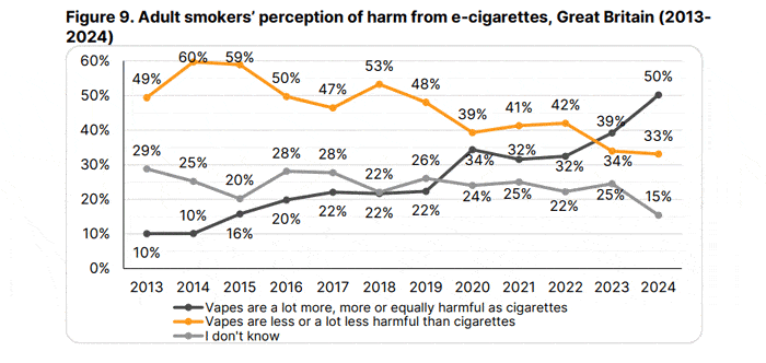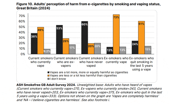 Unfortunately 50% of smokers incorrectly believe that vaping is equally or more harmful than smoking. ASH say this is the highest figure with negative views of vaping. Only 1/3 of smokers understand that vaping is less harmful than smoking.
