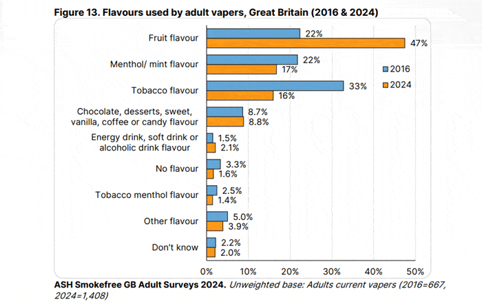 When it comes to flavours Fruit is the most popular at 47%, then Menthol/Mint at 17%. Tobacco is the favourite of 16%.