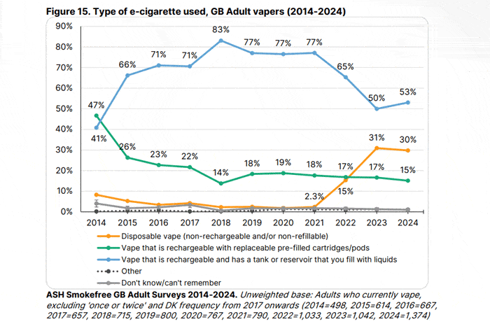 When it comes to disposable vapes these are popular with 30% of vapers who use these as their main device. This figure appears to have dropped slightly from 2023 when it was at 31%.