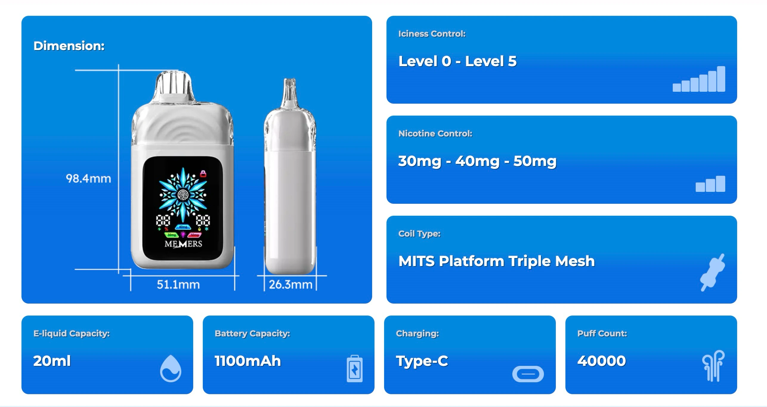 The vape offers unprecedented control with adjustable Ice and Nicotine levels Control System. Whether you prefer a cool, refreshing hit or something more neutral, the Ice Control feature lets you select from more levels: No Ice, Low, Medium, or Brain Freeze... On the nicotine side, users can choose from No Nic, 30mg, 40mg, 50mg and Regular, or Strong, making it versatile enough to suit both new and experienced vapers.